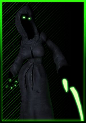 Scythes or Shadow Scythes, are shadowed primarily converted in the frequencies of the Outer Darkness. There, in these evil realms of spirit, lurk souls that have done foul things in the Physical World, tainting their spiritual vibrations and causing them to exist in the hellish planes. The Anax seeks the souls of the living, but usually has only Halloween night to collect souls from the mortal plane. However, in the Shadowlands, he spends all his time lording over the Shadowed. His minions constantly seek out other spirits of that particular realm and those above it in the Outer Darkness, and fight them in order to add them to the faction. Scythes are such beings. Generally composed of specters and other incorporeal spirits of the Outer Darkness, they are silent and float. However, they have a long arm that is shaped like an actual scythe, hence their name. Resembling the mythological Grim Reaper, they slice the very souls of their prey, sharing their eternal fate by turning them into shadow scythes as well.